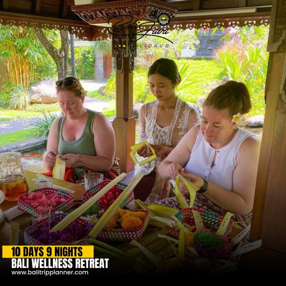 Join a 10 Days 9 Nights Bali Wellness Retreat. The trip is designed for travelers who appreciate beauty and want to escape to Bali to relax. This 10 Days 9 Nights Bali Wellness Retreat is a combination of daily sunrise yoga sessions overlooking Canggu’s green rice fields, deep healing therapies such as Balinese spa massages and palm readings by shamans, sacred spiritual rituals like Canang Sari offerings and Melukat cleansing at Taman Beji Griya Waterfall, and authentic cultural experiences including cooking classes at traditional markets.